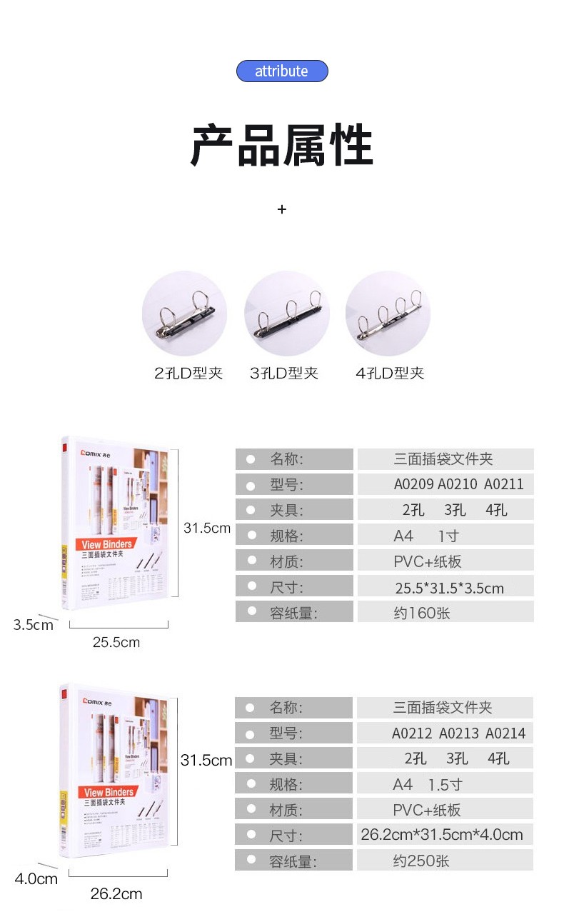 齐心(COMIX)快劳夹A4打孔文件夹三面插页活页夹 1.5寸3孔A0213(可装250页A4纸)