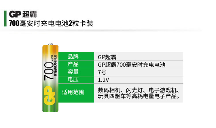 超霸(GP)充电电池7号2粒700mAh镍氢电池 适用于手电筒/剃须刀/遥控玩具车/鼠标/键盘等7号/AA/商超同款