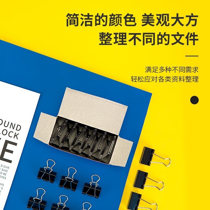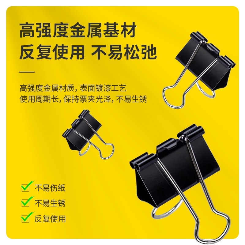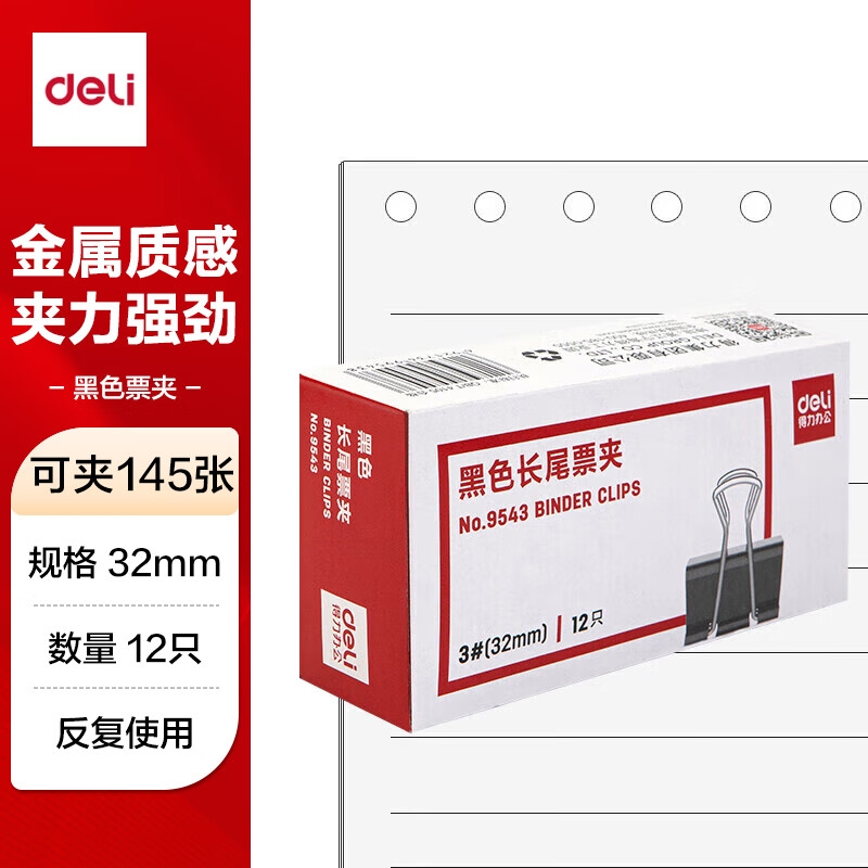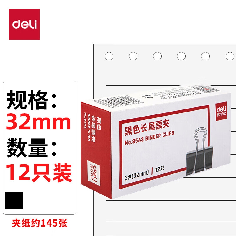 得力(deli)32mm中号金属黑色长尾夹/票据夹/燕尾夹/铁夹子/文件夹子 12只/盒 9543