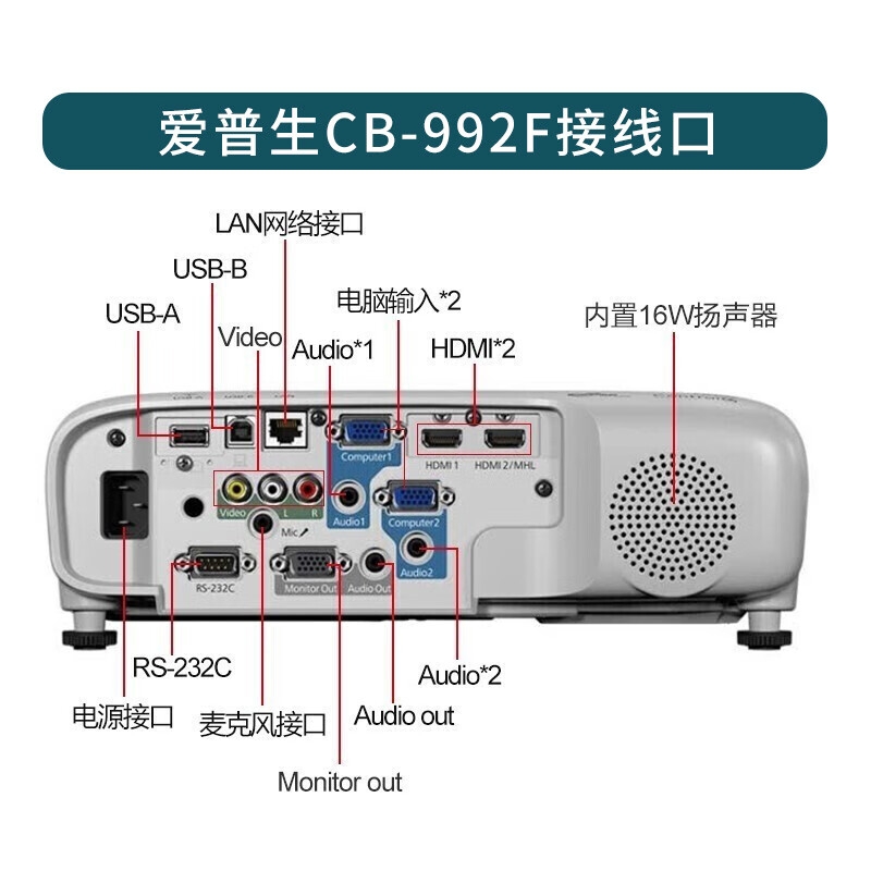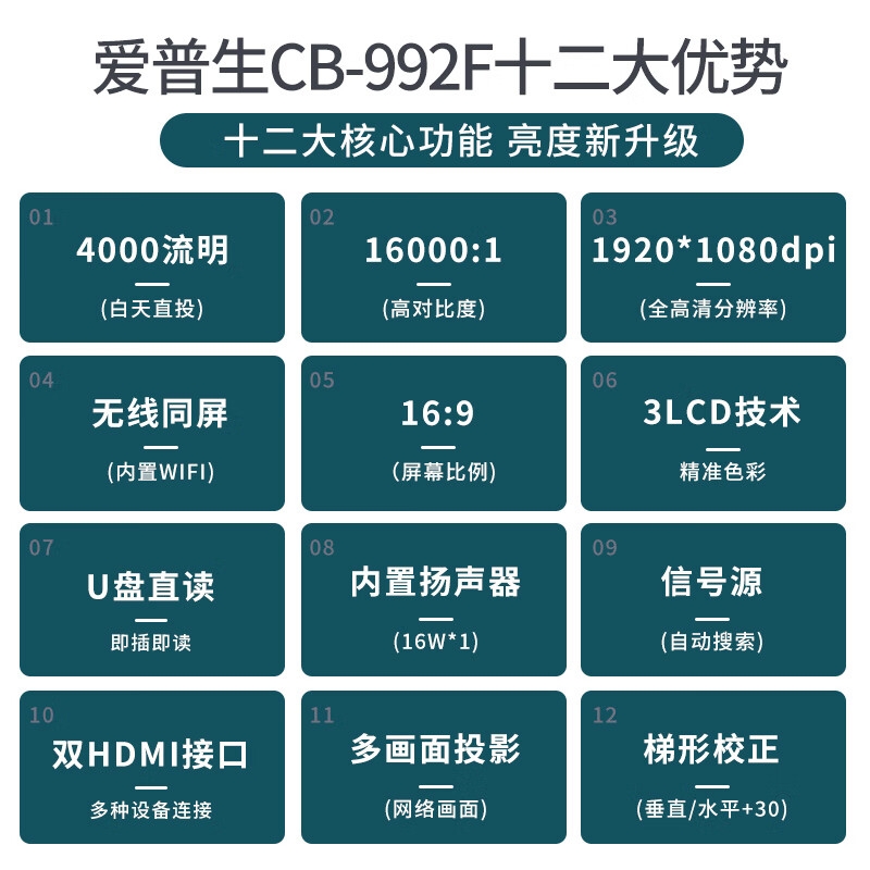 爱普生(EPSON) 会议专业投影仪 工程商务会议办公商用教育培训超清超亮 无线同屏大型会议投影机 CB-992F [4000流明 双高清接口]